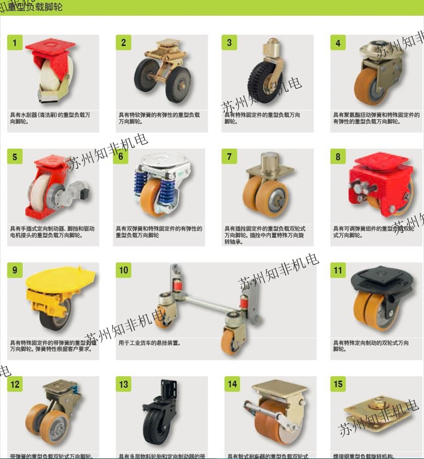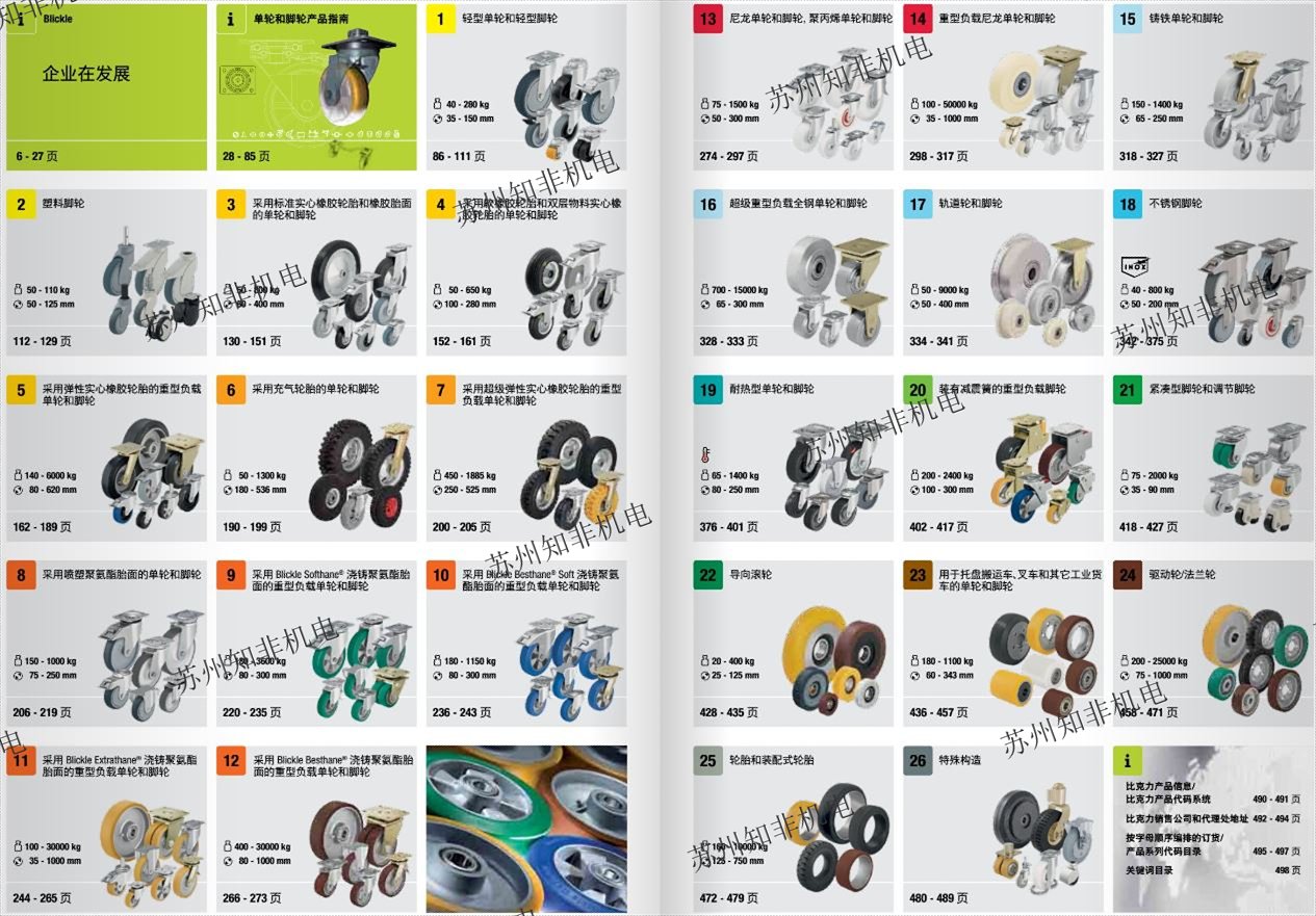比克力單輪和腳輪可應(yīng)用于商業(yè)貨車、供膠箱機(jī)架、輸送設(shè)備、線路拖車、運(yùn)送車、地板滑車和分類設(shè)備。內(nèi)部物品范圍涵蓋重型負(fù)載單輪、驅(qū)動(dòng)輪、負(fù) 載腳輪、萬(wàn)向腳輪、定向腳輪、裝有減震彈簧的腳輪和導(dǎo)向滾輪。可供貨的型號(hào)包括各類制動(dòng)系統(tǒng)、導(dǎo)電或抗靜電腳輪、地板保護(hù)性或可承受動(dòng)態(tài)高負(fù)載的單輪 和腳輪等。