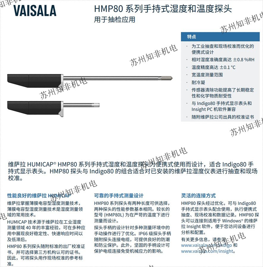 Vaisala HMP80系列維薩拉手持式露點(diǎn)儀濕度和溫度探頭為便攜式使用而設(shè)計(jì),適合 Indigo80 手持式顯示表頭。HMP80 探頭與 Indigo80 的組合適合對(duì)已安裝的維薩拉濕度儀表進(jìn)行抽查和現(xiàn)場校準(zhǔn)。